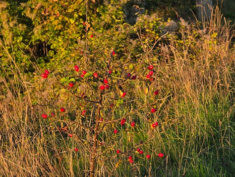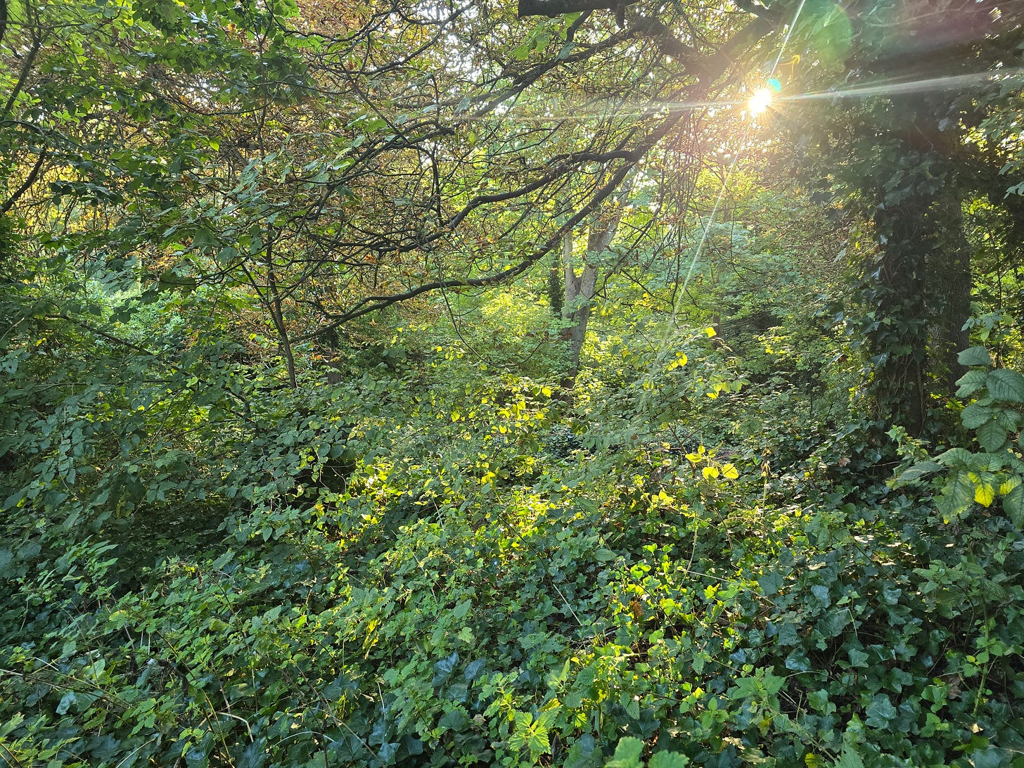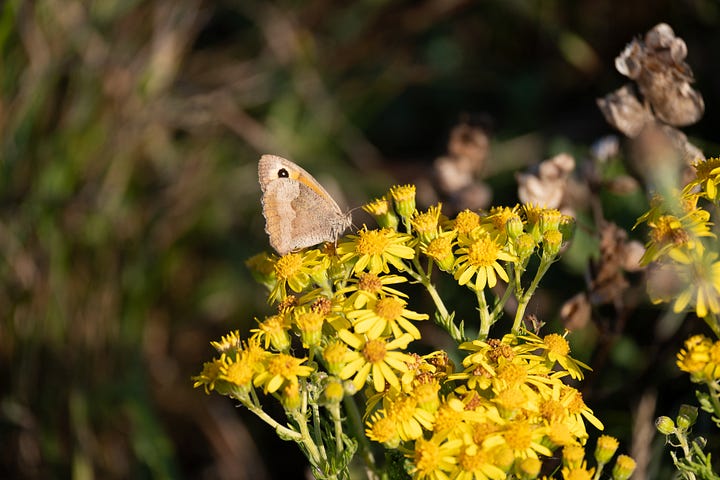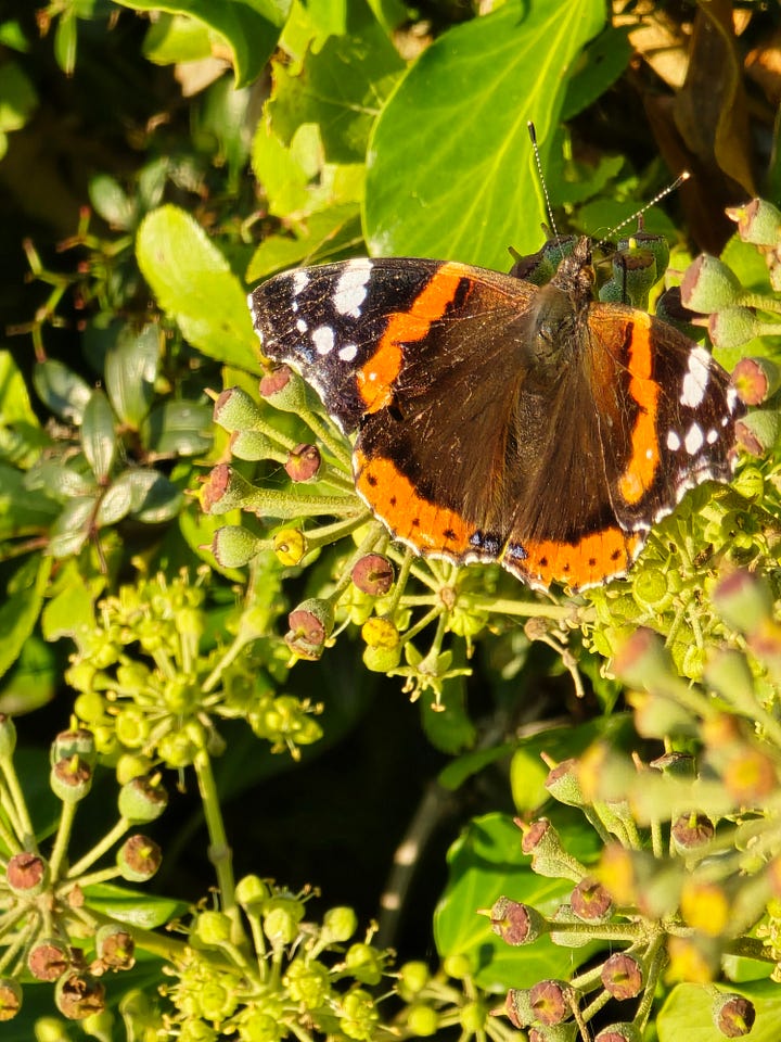 As the sun rises, the vibrant red rosehips and hawthorn berries glisten in the morning dew. I carefully make my way down the uneven rocky path, and take a look at the abundant patch of ivy flowers. There are an incredible number of pollinators, many more than I’ve ever noticed before. Red admiral butterflies, bees, wasps and hoverflies and probably others too, all enjoying the flowers of the ivy. It’s in the perfect location for the morning light, and the insects are making the most of it. My inner child is enchanted and filled with glee and excitement. I’m completely immersed in the moment, watching the pollinators busy at work.