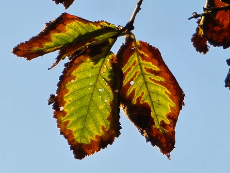 A man interrupts the blissful moment by throwing large pebbles on the beach. I wonder at why we feel drawn to throw rocks into the sea, what is it that makes us do this? Is it us trying to connect with nature? Is it a way to release emotions? Is it something ancient and primal within us? With the moment disturbed, I leave the hollow of paradise and make my way through the small wood. The floor is now carpeted with dry, crispy leaves which have a satisfying crunch when walked on. A mini autumn wonderland. I don’t spot any fungi, but do forage a few conkers from the horse chestnut trees that flowered so beautifully earlier in the year. The robins seem to be back in full song and fill the air with their lovely sweet songs.