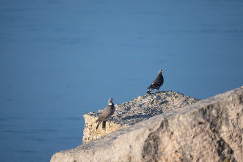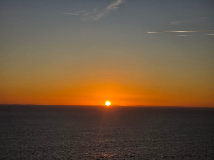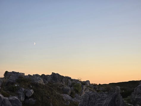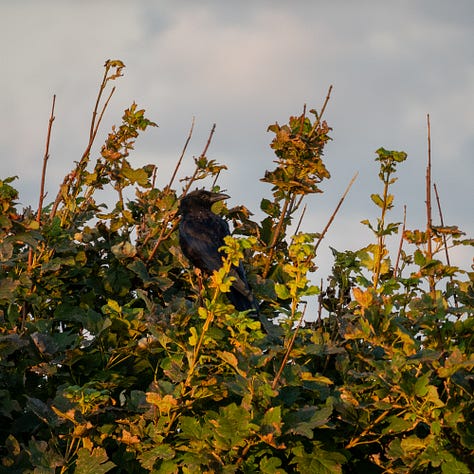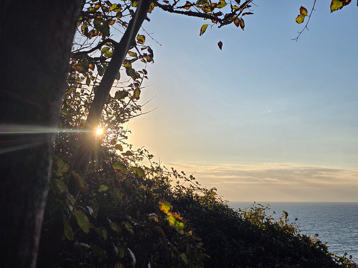 The fox is in the quarry again. I saw it here once before. It spots me and doesn’t seem impressed that I know it is there. Walking familiar routes adds to my local inner memory bank, deepening the experience. Noticing new things and acquiring more knowledge provides fresh meaning to each new walk on this route. I reach ‘Sunrise Rock’ as I’ve now named it, and take a perch, revelling in the peace and quiet, thankful for it’s strong, grounding presence beneath me. A welcome antidote to the permeated internal chaos. I breathe in deeply, inhaling the scent of the sea, diffusing the internal pressure I’ve felt building up. I take some photos, and consider how, even though the photo is beautiful - it’s the sounds of birdsong, waves, the light breeze, the chilly air, it’s all of the senses that make the scene alive and memorable. I slowly savour the hot flask of tea, and save some for further along the walk. A group of about twelve ravens are circling in the sky, seemingly conversing with each other. I’ve never seen ravens do this before, especially not so many of them. They appear to be communing, and showing off their amazing acrobatic skills. One did a barrel roll and several others appeared to free fall, tumbling and twisting in the air. It was so fantastic to watch for at least twenty minutes. Have you ever witnessed ravens doing this? What does it mean?