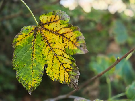 I finish heading down the steps to the little alcove. As usual, no-one is here, so I take full advantage of sitting on the bench and enjoy the solitude. The weather is so lovely that I revel in the bright warm sunshine, the crisp blue skies and the very slight breeze. I bask in the warmth and slowly finish the flask of tea. As I look around me, I notice a sycamore leaf. Its veins are delicately outlined amongst its emerging autumn colours, the energy returning to the tree. The nature of nature. No forcing, it just is.